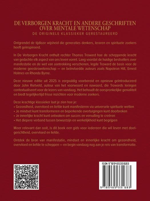 Ontgrendel de tijdloze wijsheid die generaties denkers, leraren en spirituele zoekers heeft geïnspireerd. In De Verborgen Kracht onthult rechter Thomas Troward hoe de scheppende kracht van gedachte elk aspect van ons leven vormt. Lang voordat de huidige bestsellers over manifestatie en de wet van aantrekking verschenen, legde Troward de basis voor de moderne geesteswetenschap — en beïnvloedde auteurs zoals Napoleon Hill, Ernest Holmes en Rhonda Byrne. Deze nieuwe editie uit 2025 is zorgvuldig voorbereid en opnieuw geïntroduceerd door John Rietveld, auteur van het voorwoord en nawoord, die Trowards leringen contextualiseert voor de lezers van vandaag. Het behoudt de oorspronkelijke genialiteit en biedt tegelijkertijd frisse inzichten voor moderne zoekers. Deze krachtige klassieker laat je zien hoe je: ● Gezondheid, overvloed en liefde kunt manifesteren via universele spirituele wetten ● Je mindset kunt transformeren en beperkende overtuigingen kunt doorbreken ● Je innerlijke kracht kunt ontwaken om succes en vervulling te creëren ● Het diepere verband tussen bewustzijn en werkelijkheid kunt begrijpen Meer relevant dan ooit, is dit boek een gids voor iedereen die wil leven met doelgerichtheid, overvloed en liefde. Ontdek de bron van manifestatie, mindset en innerlijke kracht om gezondheid, overvloed en liefde te scheppen — en begin vandaag nog aan je reis van transformatie.