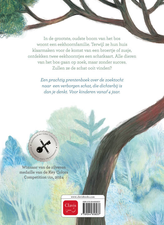 In de grootste, oudste boom van het bos woont een eekhoornfamilie. Terwijl ze hun huis klaarmaken voor de komst van een broertje of zusje, ontdekken twee eekhoorntjes een schatkaart. Alle dieren van het bos gaan op zoek, maar zonder succes. Zullen ze de schat ooit vinden?