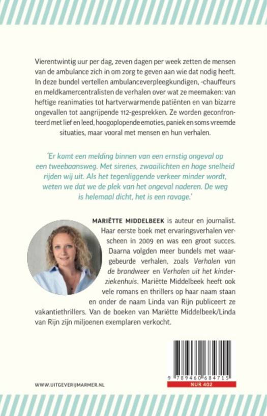 Vierentwintig uur per dag, zeven dagen per week zetten de mensen van de ambulance zich in om zorg te geven aan wie dat nodig heeft. In deze bundel vertellen ambulanceverpleegkundigen, -chauffeurs en meldkamercentralisten de verhalen over wat ze meemaken: van heftige reanimaties tot hartverwarmende patiënten en van bizarre ongevallen tot aangrijpende 112-gesprekken. Ze worden geconfronteerd met lief en leed, hoogoplopende emoties, paniek en soms vreemde situaties, maar vooral met mensen en hun verhalen.