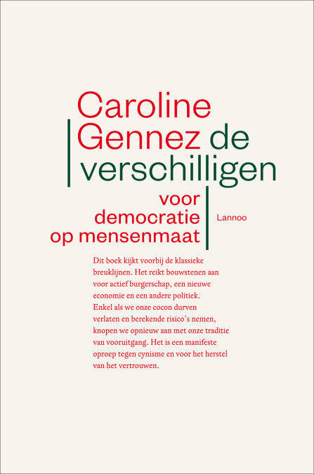 Caroline Gennez haalt onze samenleving uit haar sluimerstand 20 jaar is Caroline Gennez actief in de politiek. Ze schreef het voorbije jaar een uitdagende, maar optimistische toekomstvisie neer voor onderwijs, economie en politiek. Centraal in haar betoog staat het 'stakeholdersmodel'. De burger moet mee vorm kunnen geven aan onderwijs met een naadloze integratie van gezin, school en buurt. Onze virtuele economie moet worden teruggebracht op mensenmaat: ze moet werken en ondernemen weer oprecht valoriseren. En de burgers moeten meer deelgenoot worden aan de politieke besluitvorming. Enkel op die manier stijgt het individueel en maatschappelijk vertrouwen en kunnen we weer geloven in vooruitgang. Zo een model kan echter alleen maar functioneren als er dialoog is en als we openstaan voor de verschillen in de maatschappij.