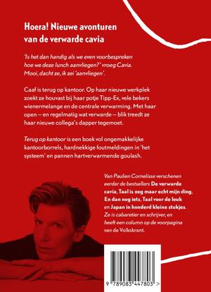 CAAF IS TERUG OP KANTOOR, HOERA! Op haar nieuwe werkplek laaft ze zich aan schriftjes, gummetjes en de centrale verwarming. Ze beseft nu pas hoezeer ze het kantoorleven heeft gemist. Met haar open - en regelmatig wat verwarde - blik, treedt Cavia haar nieuwe collega'stegemoet. Otto van Facturatie, die tijdens werktijd zijn verzameling WOII-parafernalia cureert, Helma van Communicatie, die jubelt dat Caaf de nieuwsbrief van haar overneemt en collega Van Put die er al dertig jaar schijnt te werken, maar zelden wordt waargenomen. Terug op kantoor is een grappig en ontroerend boek. De kantooravonturen van Cavia zijn een feest der herkenning voor iedereen die ooit op een kantoor heeft gewerkt, al was het maar een vakantiebaantje. Van ongemakkelijke kantoorborrels en hardnekkige foutmeldingen in 'het systeem' tot wiener melanges en een pijnlijke ontslagronde.