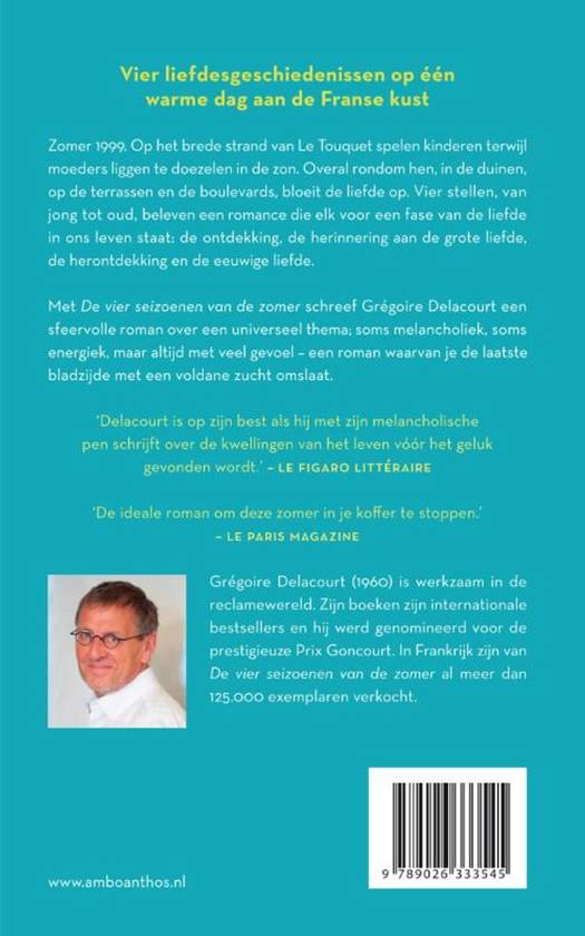 Zomer 1999. Op het brede strand van Le Touquet spelen kinderen terwijl moeders liggen te doezelen in de zon. Overal rondom hen, in de duinen, de cafés en op de steigers, bloeit de liefde op. Vier stellen van 15, 35, 55 en 75 ontmoeten elkaar, zich onbewust van de invloed die ze op elkaar hebben. Ze staan voor alle fases van de liefde in ons leven: de ontdekking van de liefde, de herinnering aan een grote liefde, de herontdekking van de liefde en de eeuwige liefde. Grégoire Delacourt schreef met 'De vier seizoenen van de zomer' een elegante roman over een universeel thema: soms melancholiek, soms energiek, maar altijd met veel gevoel.