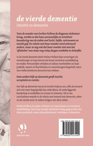 Evelien Pullens laat in 'De vierde dementie, intuïtie en dementie' als ervaringsdeskundige en zorgprofessional zien hoe je op een andere manier kunt omgaan met iemand met dementie. De ouderdom is geen gemakkelijke levensfase, zeker niet als deze met gebreken komt, waarvan dementie misschien wel een van allermoeilijkste is. Je kunt blijven kijken naar het verlies en het verdriet dat deze wrange en soms mensonterende ziekte met zich meebrengt, maar wie de stap maakt om op een ander niveau (de vierde, onzichtbare dimensie) contact te maken, zal ontdekken dat dit vertrouwen, liefde en verrijkende inzichten oplevert, plus een blijvend contact met een dierbare. In dit boek geeft Evelien Pullens aan de hand van vele persoonlijke verhalen en voorbeelden uit haar eigen leven - haar moeder heeft Alzheimer- handvatten om die onderliggende boodschap te ontdekken.