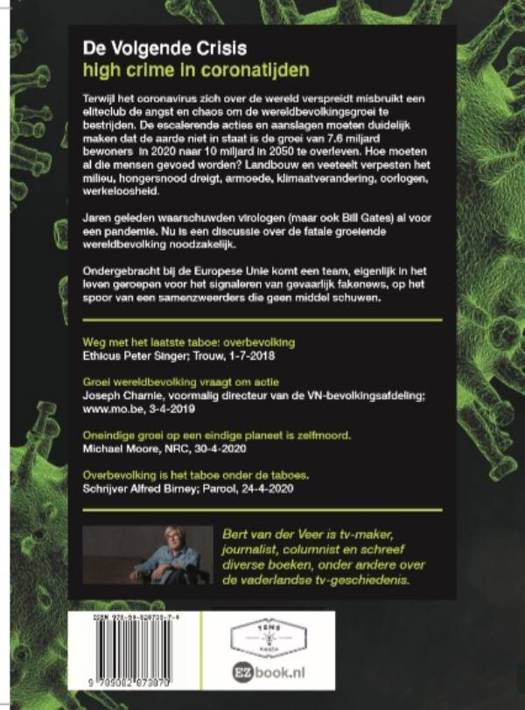 Terwijl het coronavirus zich over de wereld verspreidt misbruikt een eliteclub de angst en chaos om de wereldbevolkingsgroei te bestrijden. De escalerende acties en aanslagen moeten duidelijk maken dat de aarde niet in staat is de groei van 7.6 miljard bewoners in 2020 naar 10 miljard in 2050 te overleven. Hoe moeten al die mensen gevoed worden? Landbouw en veeteelt verpesten het milieu, hongersnood dreigt, armoede, klimaatverandering, oorlogen, werkeloosheid. Jaren geleden waarschuwden virologen (maar ook Bill Gates) al voor een pandemie. Nu is een discussie over de fatale groeiende wereldbevolking noodzakelijk. Ondergebracht bij de Europese Unie komt een team, eigenlijk in het leven geroepen voor het signaleren van gevaarlijk fakenews, op het spoor van een samenzweerders die geen middel schuwen.