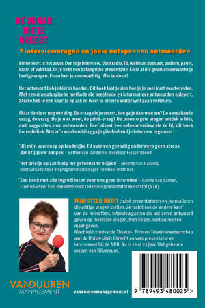 Hoe je dat doet? Met de dramaturgische kaartjesmethode. Een kaartje met wat tekeningen op zak geeft een prima start. En als er dan tijdens het interview opeens een onverwachte vraag komt, ben je daar met De vraag die je vreest goed op voorbereid. Want in dit boek behandelt Machteld Kooij de zeven spannendste interviewvragen. Uiteraard mét antwoordsuggesties. Zo overleef je niet alleen ieder interview, maar heb je er ook plezier in!