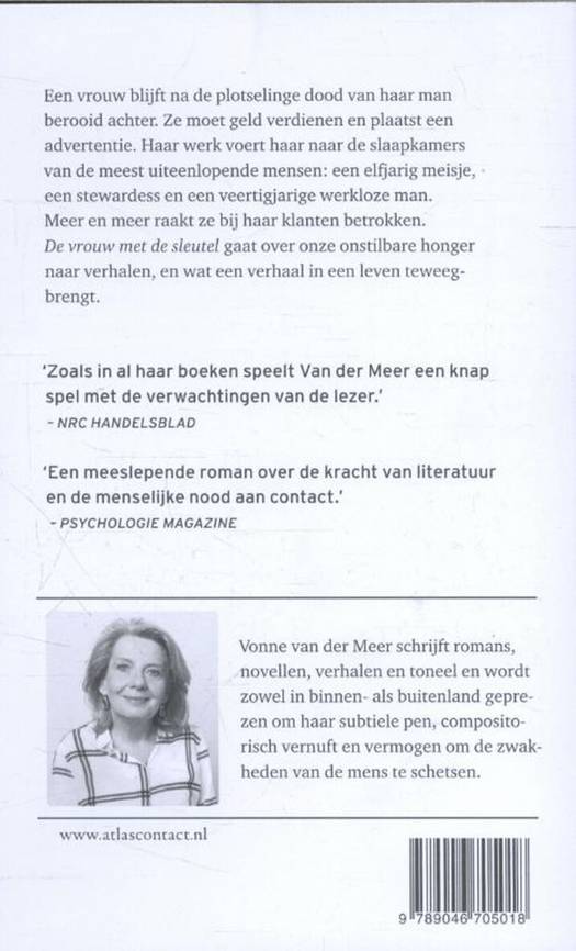 Een vrouw blijft na de plotselinge dood van haar man berooid achter. Ze moet geld verdienen en plaatst een advertentie. Haar werk voert haar naar de slaapkamers van de meest uiteenlopende mensen: een elfjarig meisje, een stewardess, een veertigjarige werkloze man. Meer en meer raakt ze bij haar klanten betrokken. De vrouw met de sleutel gaat over onze onstilbare honger naar verhalen, en wat een verhaal in een leven teweegbrengt.