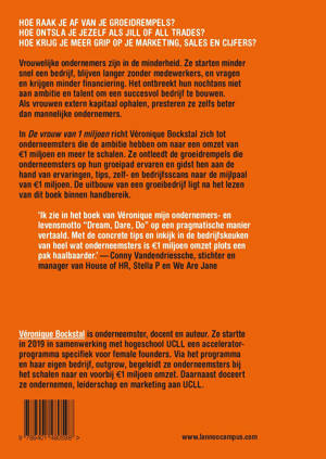 In De vrouw van 1 miljoen richt Véronique Bockstal zich tot onderneemsters die de ambitie hebben om naar een omzet van €1 miljoen en meer te schalen. Ze ontleedt de groeidrempels die onderneemsters op hun groeipad ervaren en gidst hen aan de hand van ervaringen, tips, zelf- en bedrijfsscans naar de mijlpaal van €1 miljoen. De uitbouw van een groeibedrijf ligt na het lezen van dit boek binnen handbereik.