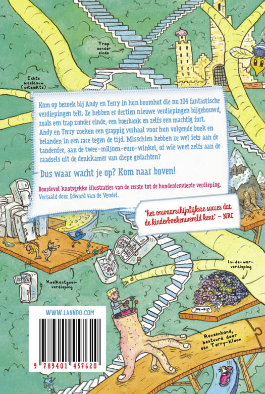 Kom op bezoek bij Andy en Terry in hun boomhut die nu 104 fantastische verdiepingen telt. Ze hebben er dertien nieuwe verdiepingen bijgebouwd, zoals een trap zonder einde, een boerbank en zelfs een machtig fort.
