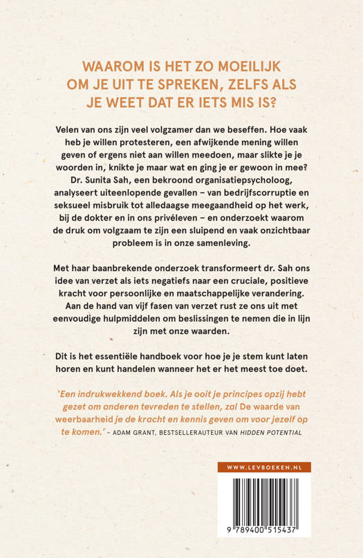 Hoe vaak hebben we niet willen protesteren, onze mening willen geven of iets willen afwijzen, maar ons toch aangepast en gezwegen? Waarom is de druk om te conformeren zo sterk? Aan de hand van haar baanbrekende onderzoek en inspirerende voorbeelden laat dr. Sah zien hoe weerbaarheid een positieve kracht kan zijn voor persoonlijke en sociale verandering. Door de vijf fasen van weerbaarheid te verkennen, geeft ze de lezer praktische tools om op te komen voor hun eigen waarden en overtuigingen.