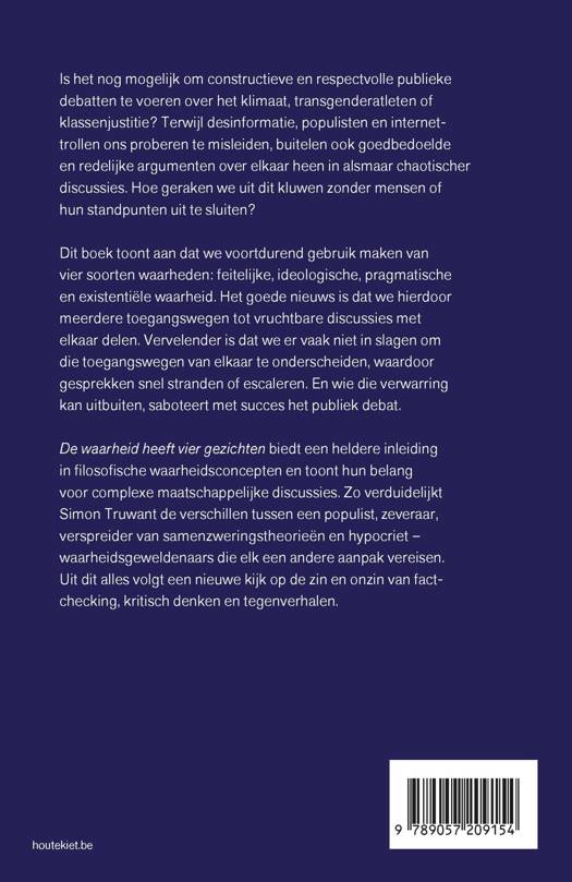 De waarheid heeft vier gezichten biedt een heldere inleiding in filosofische waarheidsconcepten en toont hun belang voor complexe maatschappelijke discussies. Zo verduidelijkt Simon Truwant de verschillen tussen een populist, internettrol, verspreider van samenzweringstheorieën en haatprediker - waarheidsgeweldenaars die elk een andere aanpak vereisen. Uit dit alles volgt een nieuwe kijk op de zin en onzin van factchecking, kritisch denken en tegenverhalen.