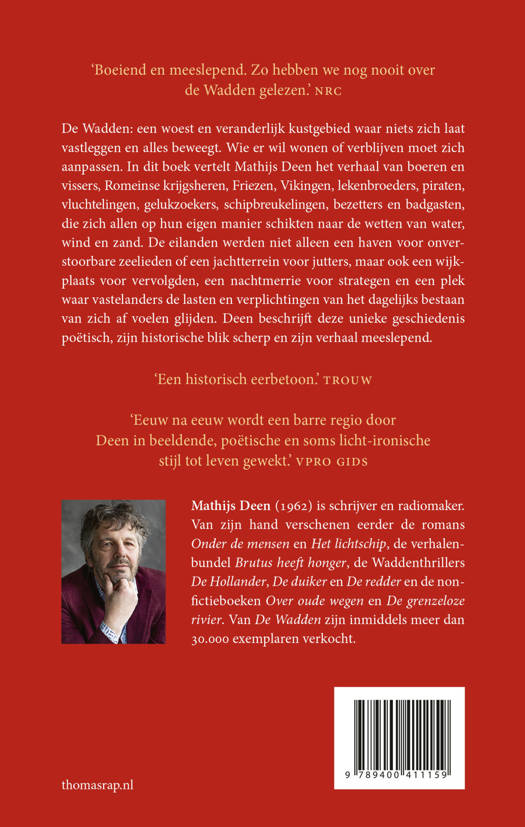 De Wadden: een woest en veranderlijk kustgebied waar niets zich laat vastleggen en alles beweegt. Wie er wil wonen of verblijven moet zich aanpassen. In dit boek vertelt Mathijs Deen het verhaal van boeren en vissers, Romeinse krijgsheren, Friezen, Vikingen, lekenbroeders, piraten, vluchtelingen, gelukszoekers, schipbreukelingen, bezetters en badgasten, die zich allen op hun eigen manier schikten naar de wetten van water, wind en zand. De eilanden werden niet alleen een haven voor onverstoorbare zeelieden of een jachtterrein voor jutters, maar ook een wijkplaats voor vervolgden, een nachtmerrie voor strategen en een plek waar vastelanders de lasten en verplichtingen van het dagelijks bestaan van zich af voelen glijden. Deen beschrijft deze unieke geschiedenis poëtisch, zijn historische blik scherp en zijn verhaal meeslepend.