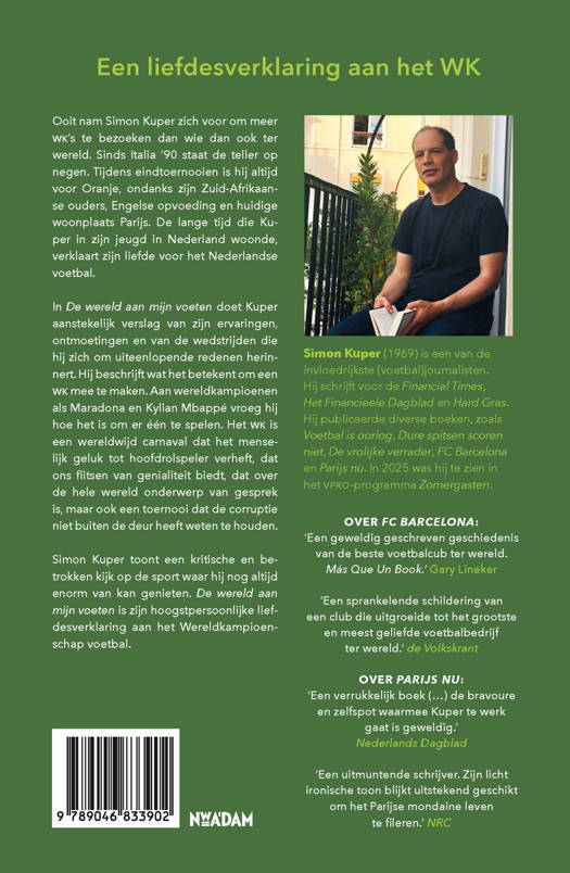 Ooit nam Simon Kuper zich voor meer Wereldkampioenschappen voetbal te bezoeken dan wie ook ter wereld. De teller staat inmiddels op negen, nadat hij zijn eerste WK in 1990 in Italië aandeed. En ondanks zijn Zuid-Afrikaanse ouders, zijn Engelse opvoeding en zijn huidige woonplaats Parijs is hij op eindtoernooien altijd voor Oranje. Kuper woonde in zijn jeugd lange tijd in Leiden en dat verloochent zich niet. In De wereld aan mijn voeten doet hij anekdotisch en aanstekelijk verslag van zijn ervaringen, ontmoetingen en wedstrijden die hij zich om diverse redenen herinnert. Tussen de regels laat hij de lezers met hem meegenieten van de mooiste sport op aarde. Je ervaart het WK en begrijpt wat het WK betekent en wie de mensen uit het gastland zijn. Hoe we hun land leren kennen en wat het zegt over de globalisering. Hij geeft blijk van een kritische, journalistieke en betrokken kijk op de sport waarop hij nog lang niet is uitgekeken. De wereld aan mijn voeten is Kupers hoogstpersoonlijke liefdesverklaring.