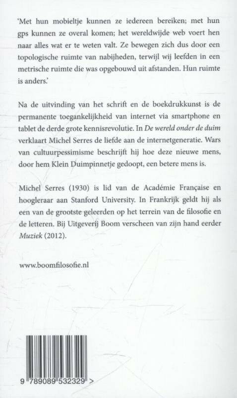 Na de uitvinding van het schrift en de boekdrukkunst is de permanente toegankelijkheid van internet via smartphone en tablet de derde grote kennisrevolutie. In het toegankelijk geschreven De wereld onder de duim verklaart de 83-jarige filosoof Michel Serres de liefde aan de netwerkgeneratie. Wars van cultuurpessimisme beschrijft hij hoe deze nieuwe mens, door hem Duimelijntje gedoopt, een betere mens is. Van Serres verscheen eerder bij Uitgeverij Boom Muziek (2012). Michel Serres (1930) is lid van de Académie Française en hoogleraar aan de Stanford University. Hij geldt in Frankrijk als een van de grootste geleerden op het terrein van de filosofie en de letteren.