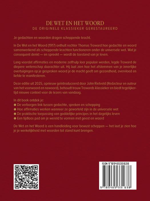 Je gedachten en woorden dragen scheppende kracht. In De Wet en het Woord (1917) onthult rechter Thomas Troward hoe gedachte en woord samenwerkend als scheppende krachten functioneren onder de universele wet. Wat je consequent denkt — en spreekt — wordt de toestand van je leven. Lang voordat affirmaties en moderne zelfhulp leer populair werden, legde Troward de diepere wetenschap daarachter uit. Hij laat zien hoe het afstemmen van je innerlijke overtuigingen op je gesproken woord je de macht geeft om gezondheid, overvloed en liefde te manifesteren. Deze editie uit 2025, opnieuw geïntroduceerd door John Rietveld (Redacteur en auteur van het voorwoord en nawoord), behoudt trouw Trowards klassieker en biedt tegelijkertijd nieuwe context voor de lezers van vandaag. In dit boek ontdek je: ● De verborgen link tussen gedachte, spreken en schepping ● Hoe affirmaties werken wanneer ze geworteld zijn in de universele wet ● De praktische toepassing van goddelijke principes in het dagelijks leven ● Een tijdloos pad om je wereld te vormen met geest en woord De Wet en het Woord is een handleiding voor bewust scheppen — het laat je zien hoe je je werkelijkheid met woorden tot stand kunt brengen.