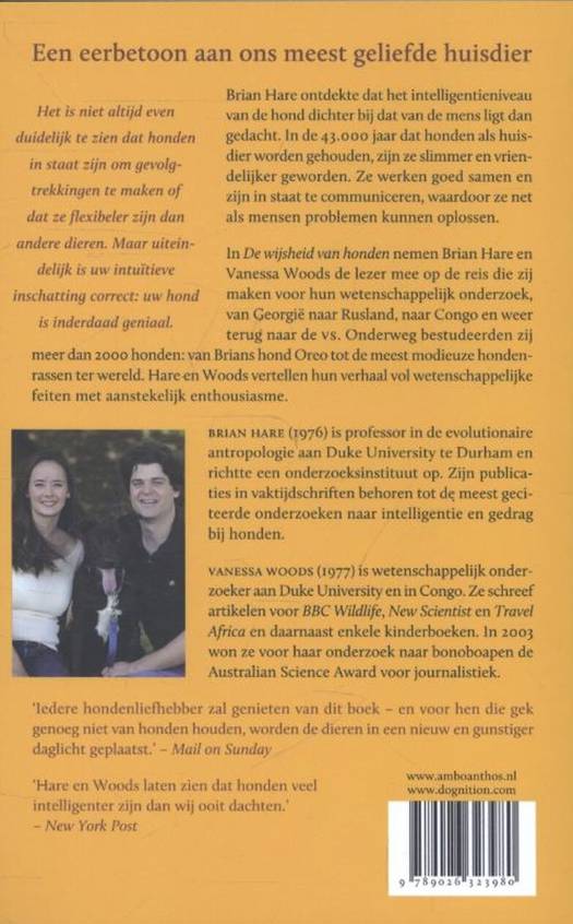 In 'De wijsheid van honden' nemen Brian Hare en Vanessa Woods de lezer mee op de reis die zij maken voor hun wetenschappelijk onderzoek, van Georgië naar Rusland, naar Congo en weer terug naar de VS. Onderweg bestudeerden zij meer dan 2000 honden: van Brians hond Oreo tot de meest modieuze hondenrassen ter wereld. Hare en Woods vertellen hun verhaal vol wetenschappelijke feiten met aanstekelijk enthousiasme.