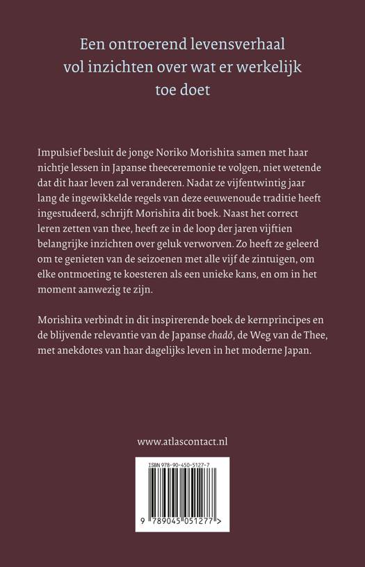 Impulsief besluit de jonge Noriko Morishita samen met haar nichtje lessen in Japanse theeceremonie te volgen, niet wetende dat dit haar leven zal veranderen. Nadat ze vijfentwintig jaar lang de ingewikkelde regels van deze eeuwenoude traditie heeft ingestudeerd, schrijft Morishita dit boek. Naast het correct leren zetten van thee, heeft ze in de loop der jaren vijftien belangrijke inzichten over geluk verworven. Zo heeft ze geleerd om te genieten van de seizoenen met alle vijf de zintuigen, om elke ontmoeting te koesteren als een unieke kans, en om in het moment aanwezig te zijn. Morishita verbindt in dit inspirerende boek de kernprincipes en de blijvende relevantie van de Japanse chadõ, de Weg van de Thee, met anekdotes van haar dagelijks leven in het moderne Japan.