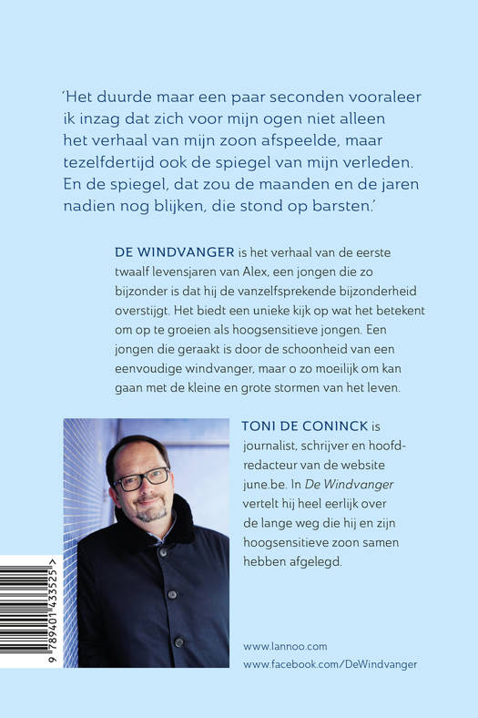 Unieke kijk op wat het betekent om op te groeien als hoogsensitieve jongen 'Het duurde maar een paar seconden vooraleer ik inzag dat zich voor mijn ogen niet alleen het verhaal van mijn zoon afspeelde, maar tezelfdertijd ook de spiegel van mijn verleden. En de spiegel, dat zou de maanden en de jaren nadien nog blijken, die stond op barsten.' De Windvanger is het verhaal van de eerste twaalf levensjaren van Alex, een jongen die zo bijzonder is dat hij de vanzelfsprekende bijzonderheid overstijgt. Het biedt een unieke kijk op wat het betekent om op te groeien als hoogsensitieve jongen. Een jongen die geraakt is door de schoonheid van een eenvoudige windvanger, maar o zo moeilijk om kan gaan met de kleine en grote stormen van het leven. Toni De Coninck is journalist, schrijver en hoofdredacteur van de website june.be. In De Windvanger vertelt hij heel eerlijk over de lange weg die hij en zijn hoogsensitieve zoon samen hebben afgelegd. Naar schatting 15 tot 20 procent van alle kinderen is hoogsensitief. Helaas stoten zij nog al te vaak op onbegrip. Zo ook de zoon van journalist Toni De Coninck. In dit boek getuigt hij heel eerlijk over wat het betekent om vader te zijn van een hoogsensitieve zoon. Zijn boek biedt steun en herkenning voor ouders, maar is door de vele voorbeelden ook nuttig voor leerkrachten en andere opvoeders. Bij het derde balletje dat ergens in een boom belandde, ging het grondig mis. De neuronen stortten zich andermaal vol overgave in dat deel van de hersenen dat de emoties beheerst. Alex liep weg, gleed uit en viel over een stom steentje dat niet helemaal vastzat in het voor het overige perfect onderhouden plaveisel. (Ik heb dat lang als een beeld gezien: zo'n asymmetrisch steentje doorbreekt de saaiheid en de monotonie, maar je struikelt er o zo gemakkelijk over.) Ik ging naast hem zitten, in de schaduw van de pingpongboom. Hij huilde, gebruikte beide armen om zijn hoofd te ondersteunen. 'Papa, mijn leven is zo slecht.' 'Maar wat zeg jij nu toch, jongen?' 'Als ik het zou kunnen, zou ik alles opnieuw willen beginnen. Van voren af aan.' Er zijn momenten in het leven waarop je het als vader ook niet meer weet. Dat je naar de juiste woorden zoekt om je kleine, jonge zoon op dat moment een hart onder de riem te steken. Maar wat vertel je aan een kind dat alles heeft om gelukkig te zijn, maar dat eigenlijk niet is?