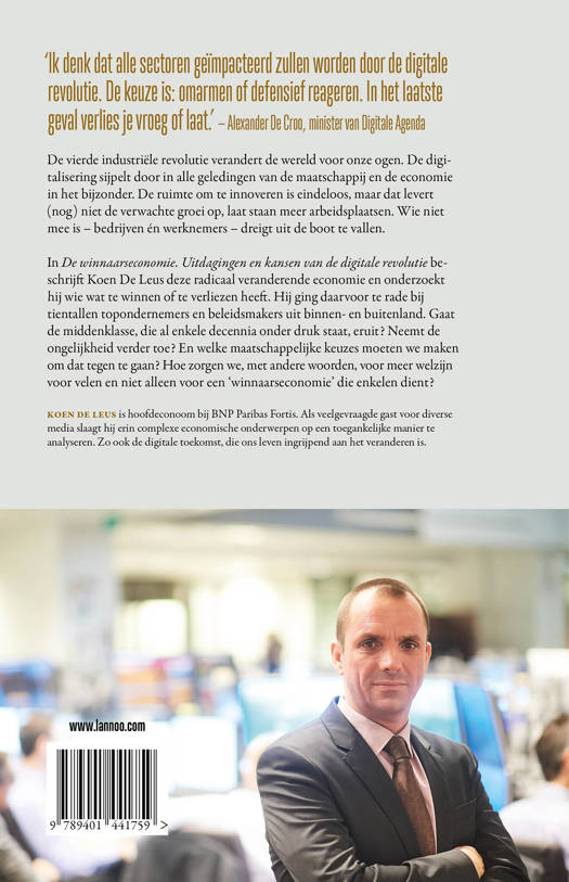 De vierde industriële revolutie verandert de wereld voor onze ogen. De digitalisering sijpelt door in alle geledingen van de maatschappij en de economie in het bijzonder. De ruimte om te innoveren is eindeloos, maar dat levert (nog) niet de verwachte groei op, laat staan meer arbeidsplaatsen. Wie niet mee is - bedrijven én werknemers - dreigt uit de boot te vallen. In De winnaarseconomie. Uitdagingen en kansen van de digitale revolutie beschrijft Koen De Leus deze radicaal veranderende economie en onderzoekt hij wie wat te winnen of te verliezen heeft. Hij ging daarvoor te rade bij tientallen topondernemers en beleidsmakers uit binnen- en buitenland. Gaat de middenklasse, die al enkele decennia onder druk staat, eruit? Neemt de ongelijkheid verder toe? En welke maatschappelijke keuzes moeten we maken om dat tegen te gaan? Hoe zorgen we, met andere woorden, voor meer welzijn voor velen en niet alleen voor een 'winnaarseconomie' die enkelen dient?