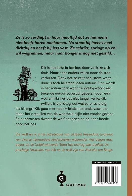 'De wolf en ik' is het fictiedebuut van Liesbeth Rosendaal, bekend van haar werk aan 'Het begon met peper' en de prijswinnende Toen het oorlog was-boeken. Door de afwisselende hoofdstukken tussen het perspectief van Kik en de wolf leren lezers beide hoofdpersonen van dichtbij kennen en sluiten ze hen onmiddellijk in hun hart. De sfeervolle zwart-witillustraties van Zilveren Penseel-winnaar Marieke ten Berge versterken de spanning en de natuurbeleving in dit verhaal over natuurbescherming, geheimen en de Veluwse bossen.