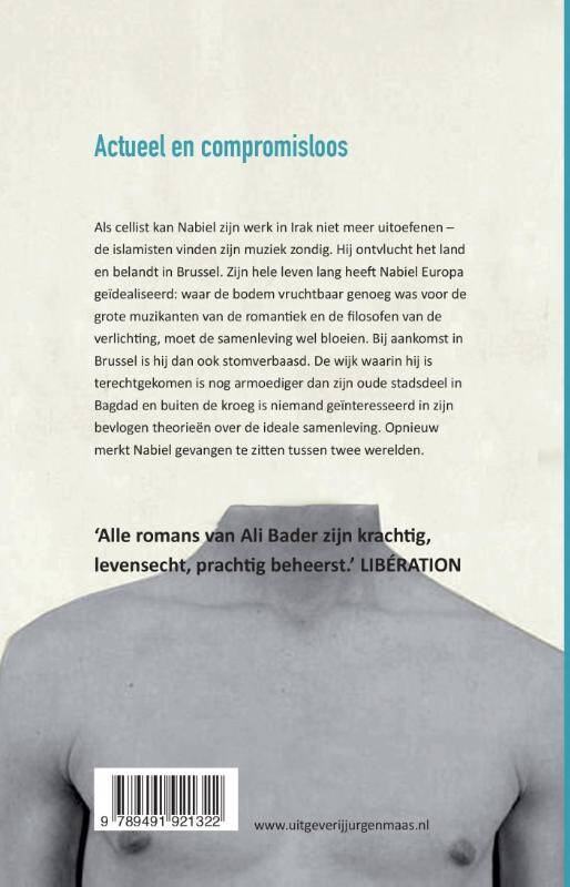 Als cellist kan Nabiel zijn werk in Irak niet meer uitoefenen - de islamisten vinden zijn muziek zondig. Hij ontvlucht het land en belandt in Brussel. Zijn hele leven lang heeft Nabiel Europa geïdealiseerd: waar de bodem vruchtbaar genoeg was voor de grote muzikanten van de romantiek en de filosofen van de verlichting, moet de samenleving wel bloeien. Bij aankomst in Brussel is hij dan ook stomverbaasd. De wijk waarin hij is terechtgekomen is nog armoediger dan zijn oude stadsdeel in Bagdad en buiten de kroeg is niemand geïnteresseerd in zijn bevlogen theorieën over de ideale samenleving. Opnieuw merkt Nabiel gevangen te zitten tussen twee werelden. In een beperkt aantal pagina's weet Bader de tegenstellingen in onze wereld bloot te leggen, waardoor alle waarheden over cultuur en identiteit die we als vanzelfsprekend beschouwen tegen het licht worden gehouden. Hij is daarbij niet bang kritisch te zijn op de multiculturele samenleving in Brussel, wat deze roman actueler dan ooit maakt. Verbluffend vakmanschap.