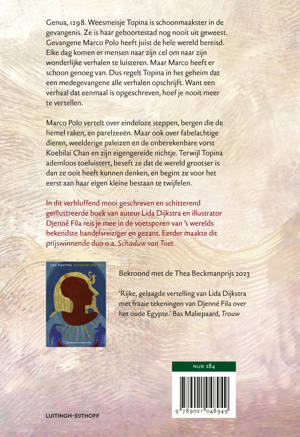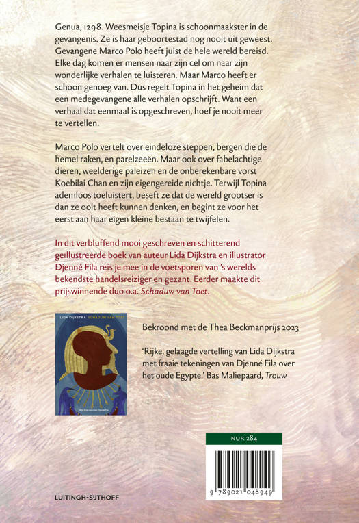 Marco Polo vertelt over eindeloze steppen, bergen die de hemel raken, en parelzeeën. Maar ook over fabelachtige dieren, weelderige paleizen, de onberekenbare vorst Koebilai Chan en zijn nichtje. Topina, die ademloos toeluistert, hoort over de grootsheid van de wereld en twijfelt voor het eerst aan haar eigen kleine bestaan.