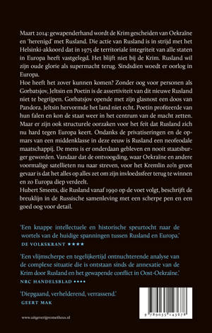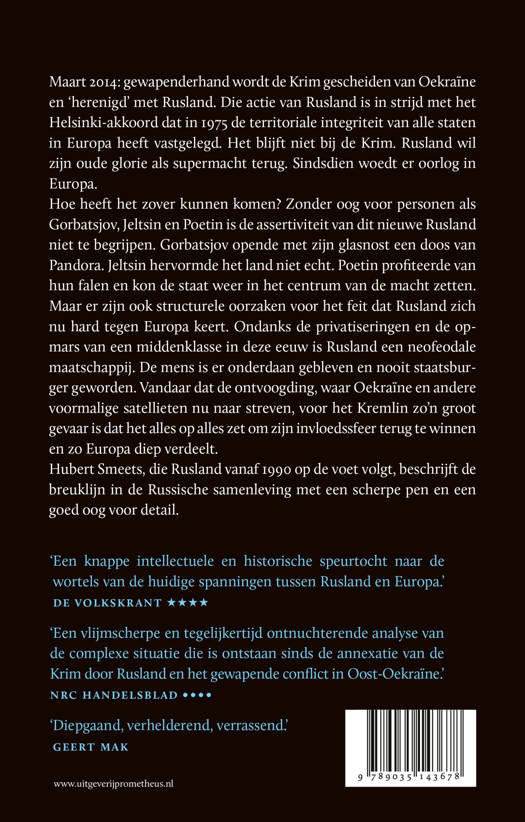 Maart 2014: gewapenderhand wordt de Krim gescheiden van Oekraïne en ‘herenigd’ met Rusland. Die actie van Rusland is in strijd met het Helsinki-akkoord dat in 1975 de territoriale integriteit van alle staten in Europa heeft vastgelegd. Het blijft niet bij de Krim. Rusland wil zijn oude glorie als supermacht terug. Sindsdien woedt er oorlog in Europa. Hoe heeft het zover kunnen komen? Zonder oog voor personen als Gorbatsjov, Jeltsin en Poetin is de assertiviteit van dit nieuwe Rusland niet te begrijpen. Gorbatsjov opende met zijn glasnost een doos van Pandora. Jeltsin hervormde het land niet echt. Poetin profiteerde van hun falen en kon de staat weer in het centrum van de macht zetten. Maar er zijn ook structurele oorzaken voor het feit dat Rusland zich nu hard tegen Europa keert. Ondanks de privatiseringen en de opmars van een middenklasse in deze eeuw is Rusland een neofeodale maatschappij. De mens is er onderdaan gebleven en nooit staatsburger geworden. Vandaar dat de ontvoogding, waar Oekraine en andere voormalige satellieten nu naar streven, voor het Kremlin zo’n groot gevaar is dat het alles op alles zet om zijn invloedssfeer terug te winnen en zo Europa diep verdeelt. Hubert Smeets, die Rusland vanaf 1990 op de voet volgt, beschrijft de breuklijn in de Russische samenleving met een scherpe pen en een goed oog voor detail.