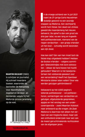 Gebaseerd op het 4000 pagina’s tellende politiedossier – vol politieverhoren, verklaringen van verdachten en getuigen, afgeluisterde gesprekken, appjes en het verslag van een undercoveroperatie – zoekt Maarten Kolsloot naar antwoord op die vragen. De Zaak Mallorca is daarmee niet alleen het verhaal van een tragische dood, maar ook een onthullend onderzoek naar een van de meest geruchtmakende rechtszaken van de afgelopen jaren.