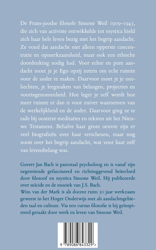 De Frans-joodse filosofe Simone Weil 1909-1943, die zich van activiste ontwikkelde tot mystica hield zich haar hele leven bezig met het begrip aandacht. Ze vond dat aandacht niet alleen opperste concentratie en opmerkzaamheid, maar ook een ethische doordenking nodig had. Voor echte en pure aandacht moet je je Ego opzij zetten om echt ruimte voor de ander te maken. Daarvoor moet je je onthechten, je leegmaken van belangen, projecties en vooringenomenheid. Hoe leger je zelf wordt hoe meer ruimte er dan is voor zuiver waarnemen van de werkelijkheid en de ander. Daarvoor ging ze te rade bij oosterse meditaties en teksten uit het Nieuwe Testament. Behalve haar grote oeuvre zijn er veel biografieën over haar verschenen, maar nog nooit over het begrip aandacht, wat voor haar zelf van levensbelang was.