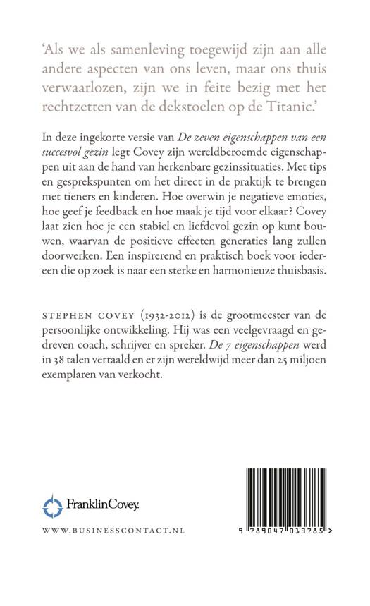 In deze ingekorte versie van 'De zeven eigenschappen van een succesvol gezin' legt Stephen Covey zijn wereldberoemde eigenschappen uit aan de hand van herkenbare gezinssituaties. Met tips en gesprekspunten om het direct in de praktijk te brengen met tieners en kinderen. Hoe overwin je negatieve emoties, hoe geef je feedback en hoe maak je tijd voor elkaar? Covey laat in 'De zeven eigenschappen van een succesvol gezin' zien hoe je een stabiel en liefdevol gezin op kunt bouwen, waarvan de positieve effecten generaties lang zullen doorwerken. Een inspirerend en praktisch boek voor iedereen die op zoek is naar een sterke en harmonieuze thuisbasis