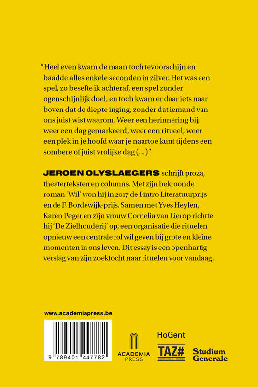 Jeroen Olyslaegers schrijft proza, theaterteksten en columns. Met zijn bekroonde roman 'Wil' won hij in 2017 de Fintro Literatuurprijs en de F. Bordewijk-prijs. Samen met Yves Heylen, Karen Peger en zijn vrouw Cornelia van Lierop richtte hij 'De Zielhouderij' op, een organisatie die rituelen opnieuw een centrale rol wil geven bij grote en kleine momenten in ons leven. Dit essay is een openhartig verslag van zijn zoektocht naar rituelen voor vandaag.