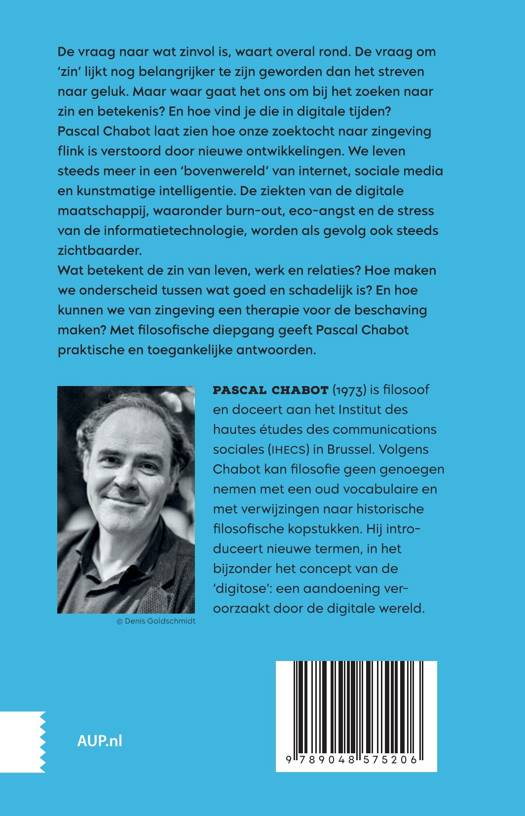 De vraag naar wat zinvol is, waart overal rond. De vraag om 'zin' lijkt nog belangrijker te zijn geworden dan het streven naar geluk. Maar waar gaat het ons om bij het zoeken naar zin en betekenis? En hoe vind je die in digitale tijden? Pascal Chabot laat zien hoe onze zoektocht naar zingeving flink is verstoord door nieuwe ontwikkelingen. We leven steeds meer in een 'bovenwereld' van internet, sociale media en kunstmatige intelligentie. De ziekten van de digitale maatschappij, waaronder burn-out, eco-angst en de stress van de informatietechnologie, worden als gevolg ook steeds zichtbaarder.