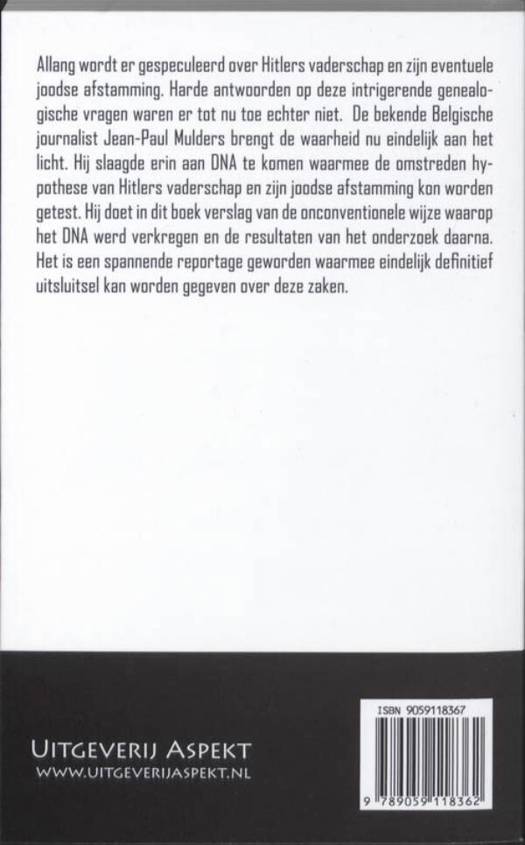 Allang wordt er gespeculeerd over Hitlers vaderschap en zijn eventuele joodse afstamming. Harde antwoorden op deze intrigerende genealogische vragen waren er tot nu toe echter niet. De bekende Belgische journalist Jean-Paul Mulders brengt de waarheid nu eindelijk aan het licht. Hij slaagde erin aan DNA te komen waarmee de omstreden hypothese van Hitlers vaderschap en zijn joodse afstamming kon worden getest. Hij doet in dit boek verslag van de onconventionele wijze waarop het DNA werd verkregen en de resultaten van het onderzoek daarna. Het is een spannende reportage geworden waarmee eindelijk definitief uitsluitsel kan worden gegeven over deze zaken.
