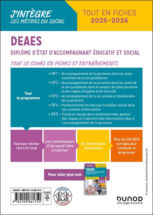 • DF1 – Accompagnement de la personne dans les actes essentiels de la vie quotidienne. • DF2 – Accompagnement de la personne dans les actes de la vie quotidienne dans le respect de cette personne et des règles d’hygiène et de sécurité. • DF3 – Accompagnement de la vie sociale et relationnelle de la personne • DF4 – Positionnement en tant que travailleur social dans son contexte d’intervention. • DF5 – Travail en équipe pluri-professionnelle, gestion des risques et traitement des informations liées à l’accompagnement de la personne. Tout pour réviser l’écrit et l’oral – Les connaissances et les savoir-faire à maîtriser – De nombreuses illustrations – Plus de 300 QCM corrigés pour s’évaluer et progresser.