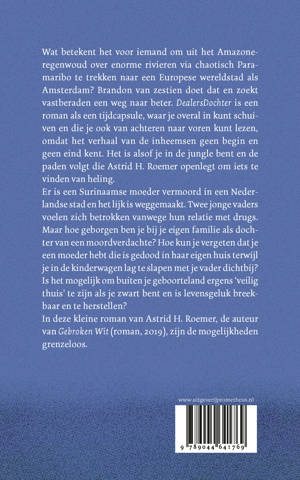 Wat betekent het voor iemand om uit het Amazoneregenwoud over enorme rivieren via chaotisch Paramaribo te trekken naar een Europese wereldstad als Amsterdam? Brandon van zestien doet dat en zoekt vastberaden een weg naar beter. DealersDochter is een roman als een tijdcapsule, waar je overal in kunt schuiven en die je ook van achteren naar voren kunt lezen, omdat het verhaal van de inheemsen geen begin en geen eind kent. Het is alsof je in de jungle bent en de paden volgt die Astrid H. Roemer openlegt om iets te vinden van heling. Er is een Surinaamse moeder vermoord in een Nederlandse stad en het lijk is weggemaakt. Twee jonge vaders voelen zich betrokken vanwege hun relatie met drugs. Maar hoe geborgen ben je bij je eigen familie als dochter van een moordverdachte? Hoe kun je vergeten dat je een moeder hebt die is gedood in haar eigen huis terwijl je in de kinderwagen lag te slapen met je vader dichtbij? Is het mogelijk om buiten je geboorteland ergens ‘veilig thuis’ te zijn als je zwart bent en is levensgeluk breekbaar en te herstellen? In deze kleine roman van Astrid H. Roemer, de auteur van Gebroken Wit (roman, 2019), zijn de mogelijkheden grenzeloos.