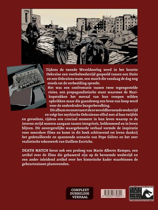 Tijdens de tweede Wereldoorlog werd in het bezette Oekraïne een voetbalwedstrijd gespeeld tussen een Duits en een Oekraïens team, een match die vandaag de dag nog steeds tot de verbeelding spreekt. Het was een confrontatie tussen twee tegengestelde visies, een propagandistische stunt waarmee de Nazi- kopstukken het moraal van hun troepen wilden opkrikken maar die gaandeweg een bron van hoop werd voor de onderdrukte burgerbevolking. Dit album reconstrueert deze wereldberoemde wedstrijd en volgt het mythische Oekraïense elftal met al hun twijfels en gevoelens, tijdens een cruciaal moment in hun leven waarop ze de interne strijd moeten aangaan tussen integriteit, heldenmoed en in leven blijven. Dit onvergetelijke waargebeurde verhaal vormde de inspiratie voor meerdere films en komt in dit boek schitterend tot leven dankzij het gedetailleerde en spannende scenario van Pepe Gálvez en het zeer realistische tekenwerk van Guillem Escriche.