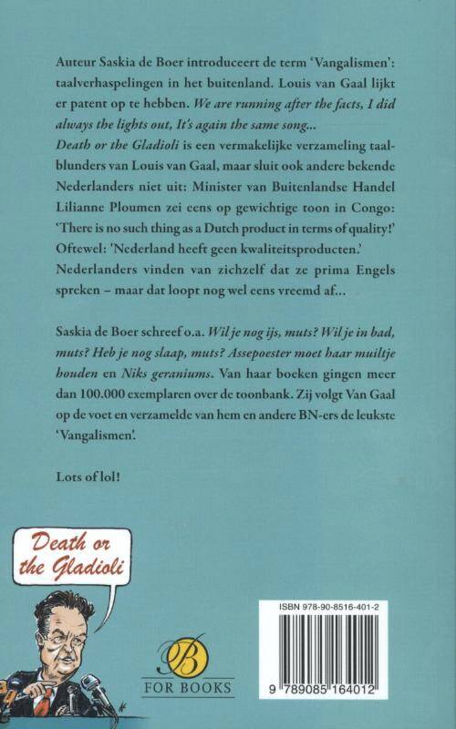 Saskia de Boer introduceert de term 'Vangalismen': taalverhaspelingen in het buitenland. Louis van Gaal lijkt er een patent op te hebben. We are running after the facts, I did always the lights out, It's again the same song... Death or the Gladioli is een vermakelijke verzameling taalblunders van Louis van Gaal, maar sluit ook andere bekende Nederlanders niet uit: Minister van Buitenlandse Handel Lilianne Ploumen zei eens op gewichtige toon in Congo: 'There is no such thing as a Dutch product in terms of quality!' Oftewel: 'Nederland heeft geen kwaliteitsproducten'.