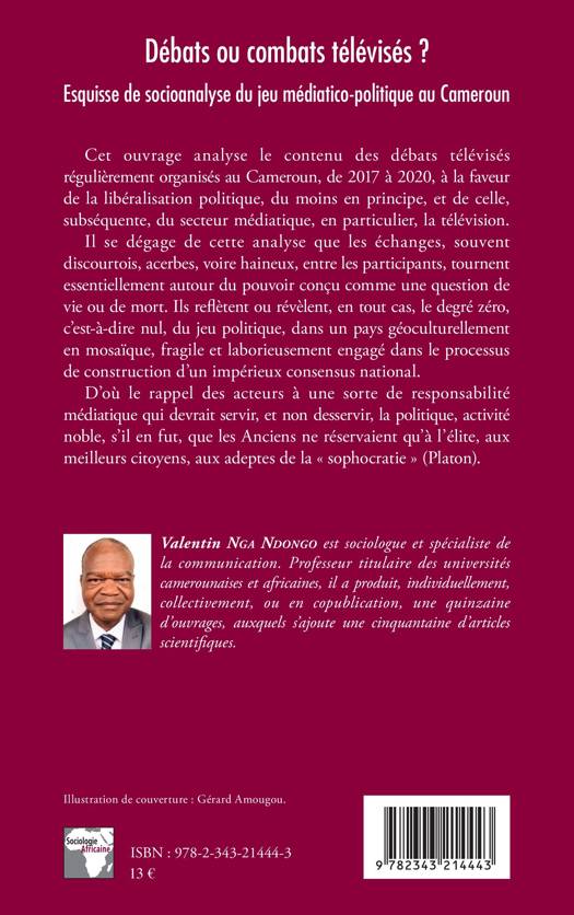 Cet ouvrage analyse le contenu des débats télévisés régulièrement organisés au Cameroun, de 2017 à 2020, à la faveur de la libéralisation politique, du moins en principe, et de celle, subséquente, du secteur médiatique, en particulier la télévision. Il se dégage de cette analyse que les échanges, souvent discourtois, acerbes, voire haineux, entre les participants, tournent essentiellement autour du pouvoir conçu comme une question de vie ou de mort. Ils reflètent ou révèlent, en tout cas, le degré zéro, c'est-à-dire nul, du jeu politique, dans un pays géoculturellement en mosaïque, fragile et laborieusement engagé dans le processus de construction d'un impérieux consensus national.