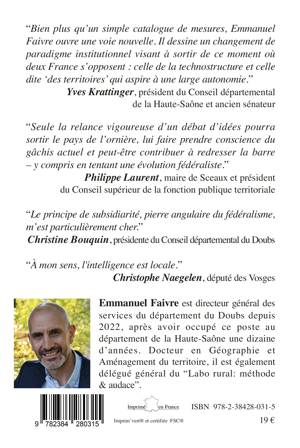 Chacun s’accorde à dire que les Français ne se reconnaissent plus dans leur vie politique, que les initiatives locales sont bridées, que le pays est menacé de décrochage. À force de supression d’impôts locaux et de dévolution de tâches pour lesquelles régions et départements n’ont aucune capacités d’initiative comme le RSA, la décentralisation a été vidée de l’essentiel de sa substance. La rigueur budgétaire a privé les collectivités locales des rares latitudes politiques qui leur restaient, les cantonant à un rôle de gestion. La situation est d’autant plus paradoxale que les doublons entre services de l’État et administrations locales sont légion, entraînant gâchis et paralysie. Pays jacobin s’il en est, la France fait figure d’exception en Europe. À l’heure où l’on prend conscience de l’efficience écologique des circuits économiques courts, il est temps de s’interroger sur la pertinence de faire remonter à Paris un nombre incalculable de décisions. Le fait que les pays les plus prospères d’Europe, la Suisse et l’Allemagne, soient des modèles de fédéralisme devrait nous interroger. Face à ces défis et actant l’échec de la décentralisation, Emmanuel Faivre propose une révolution copernicienne : repenser l’administration territoriale sur un modèle fédéral qui, tout en préservant l’unité républicaine, permette de réenchanter la politique par le bas.
