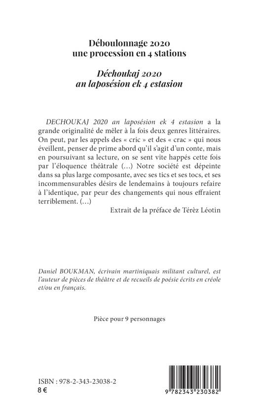 DECHOUKAJ 2020 an laposésion ek 4 estasion a la grande originalité de mêler à la fois deux genres littéraires. On peut, par les appels des « cric » et des « crac » qui nous éveillent, penser de prime abord qu’il s’agit d’un conte, mais en poursuivant sa lecture, on se sent vite happés cette fois par l’éloquence théâtrale (...) Notre société est dépeinte dans sa plus large composante, avec ses tics et ses tocs, et ses incommensurables désirs de lendemains à toujours refaire à l’identique, par peur des changements qui nous e raient terriblement. (...)