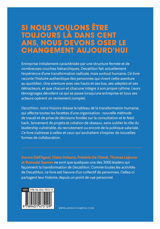 Entreprise initialement caractérisée par une structure fermée et de nombreuses couches hiérarchiques, Decathlon fait actuellement l'expérience d'une transformation radicale, mais surtout humaine. Ce livre raconte l'histoire authentique des personnes qui vivent cette aventure au quotidien. Une aventure avec ses hauts et ses bas, ses adeptes et ses détracteurs, et que chacun et chacune intègre à son propre rythme. Leurs témoignages dévoilent ce qui se passe lorsqu'une entreprise et tous ses acteurs opèrent un revirement complet.