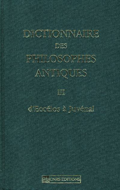 Le troisième tome du Dictionnaire regroupe 490 notices consacrées à des philosophes grecs ou romains ainsi qu'à des témoins importants de la tradition philosophique antique, d'Eccélos à Juvénal. Il a été préparé par une équipe de 59 universitaires et chercheurs français et étrangers.