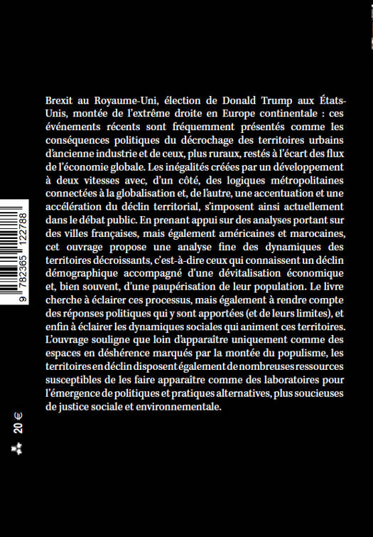 Brexit au Royaume-Uni, élection de Donald Trump aux États-Unis, montée de l'extrême droite en Europe continentale : ces événements récents sont fréquemment présentés comme les conséquences politiques du décrochage des territoires urbains d'ancienne industrie et de ceux, plus ruraux, restés à l'écart des flux de l'économie globale. Les inégalités créées par un développement à deux vitesses avec, d'un côté, des logiques métropolitaines connectées à la globalisation et, de l'autre, une accentuation et une accélération du déclin territorial, s'imposent ainsi actuellement dans le débat public. En prenant appui sur des analyses portant sur des villes françaises, mais également américaines et marocaines, cet ouvrage propose une analyse fine des dynamiques des territoires décroissants, c'est-à-dire ceux qui connaissent un déclin démographique accompagné d'une dévitalisation économique et, bien souvent, d'une paupérisation de leur population. Le livre cherche à éclairer ces processus, mais égal