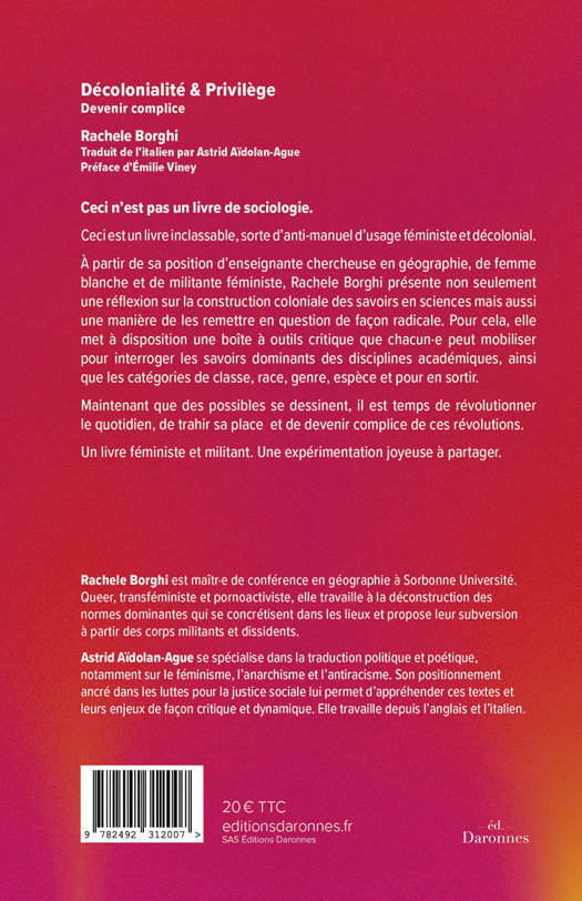 Ceci n'est pas un livre de sociologie. Ceci est un livre inclassable, sorte d'anti-manuel d'usage féministe et décolonial. À partir de sa position d'enseignante chercheuse en géographie, de femme blanche et de militante féministe, Rachele Borghi présente non seulement une réflexion sur la construction coloniale des savoirs en sciences mais aussi une manière de les remettre en question de façon radicale. Pour cela, elle met à disposition une boîte à outils critique que chacun·e peut mobiliser pour interroger les savoirs dominants des disciplines académiques, ainsi que les catégories de classe, race, genre, espèce et pour en sortir. Maintenant que des possibles se dessinent, il est temps de révolutionner le quotidien, de trahir sa place et de devenir complice de ces révolutions. Un livre féministe et militant. Une expérimentation joyeuse à partager.