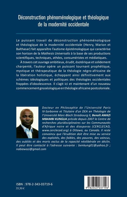 Le puissant travail de déconstruction phénoménologique et théologogique de la modernité occidentale fait apparaître l'autisme épistémologique qui caractérise son horizon de la Mathesis Universalis à la base de ses productions scientifiques, techniques, athées, consuméristes et médiatiques. A travers cet ouvrage, l'auteur opère un puissant tournant prophétique, mystique et thérapeutique de la théologie négro-africaine de la libération holistique, échappant ainsi aux schèmes idéologiques et politiques des théologies occidentales frappées d'obsolescence.