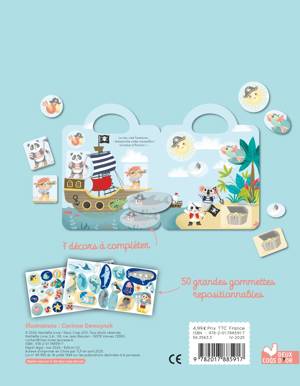 Un cahier à poignée proposant 12 pages de décors à compléter avec 50 grandes gommettes pour découvrir la mer, ses animaux et tout ce qu'on peut y faire (poissons, dauphins, bateaux, pêche, châteaux de sable, baignade, sirènes etc.). Les stickers à coller sont représentés en transparence dans les différentes scènes et guident l'enfant dans son activité. Dans chaque décor, un petit texte lui raconte en quelques mots ce qu'il s'y passe.