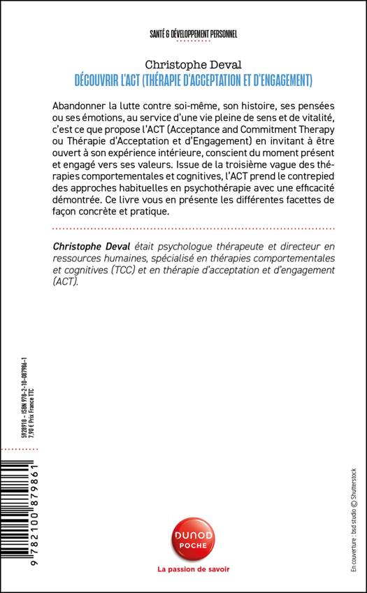 Issue de la 3e vague des thérapies comportementales et cognitives, l’ACT prend le contrepied des approches habituelles en psychothérapie avec une efficacité démontrée. Ce livre vous en présente les différentes facettes de façon concrète et pratique.