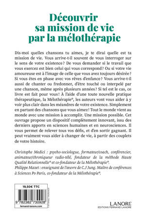 Dis-moi quelles chansons tu aimes, je te dirai quelle est ta mission de vie. Vous arrive-t-il souvent de vous interroger sur le sens de votre existence?? De vous demander si le travail que vous exercez est bien celui qui vous correspond?? Ou si votre vie amoureuse est à l’image de celle que vous avez toujours désirée?? Si vous êtes en phase avec vos rêves d’enfance?? Vous arrive-t-il aussi de chanter ou fredonner, d’être touché ou interpelé par une chanson, même après plusieurs années?? Si tel est le cas, ce livre est fait pour vous?! À l’aide d’une toute nouvelle pratique thérapeutique, la Mélothérapie®, les auteurs vont vous aider à y voir plus clair dans les méandres de votre existence. Simplement en partant des chansons que vous aimez?! Tout le monde vient au monde avec une mission à accomplir. Une mission possible. Cet ouvrage propose un dispositif complètement innovant, issu des derniers apports en sciences humaines et en neurosciences. Il vous permet de relever tous vos défis, et d’en sortir gagnant. Il peut vraiment vous aider à changer de vie, à partir des couplets de votre histoire.