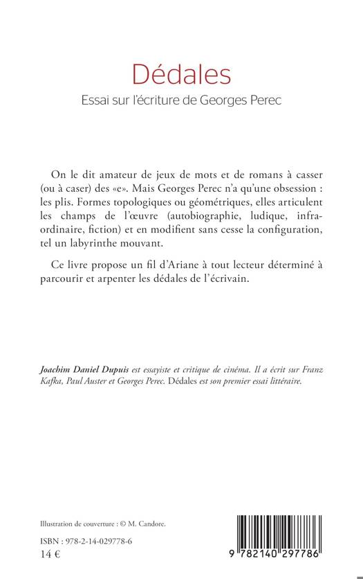 On le dit amateur de jeux de mots et de romans casser (ou caser) des ÇeÈ. Mais Georges Perec nÕa quÕune obsession: les plis. Formes topologiques ou g om triques, elles articulent les champs de lÕÏuvre (autobiographie, ludique, infra-ordinaire, fiction) et en modifient sans cesse la configuration, tel un labyrinthe mouvant. Ce livre propose un fil dÕAriane tout lecteur d termin parcourir et arpenter les d dales de l crivain.