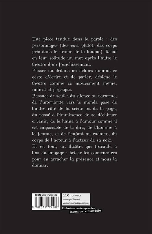 Une pièce tendue dans la parole : des personnages (des voix plutôt, des corps pris dans le drame de la langue) disent en leur solitude un mot après l'autre le théâtre d'un franchissement. Passer du dedans au dehors nomme ce geste d'écrire et de parler, désigne le théâtre comme ce mouvement même, radical et physique. Passage de seuil : du silence au vacarme, de l'intériorité vers le monde posé de l'autre côté de la scène ou de la page, du passé à l'imminence de sa déchirure à venir, de la haine à l'amour comme il est impossible de le dire, de l'homme à la femme, et de l'enfant au cadavre, du corps de l'acteur à l'acteur de sa voix. Et en tout, un théâtre qui travaille à l'os du langage : briser les convenances pour en arracher la présence et nous la donner.