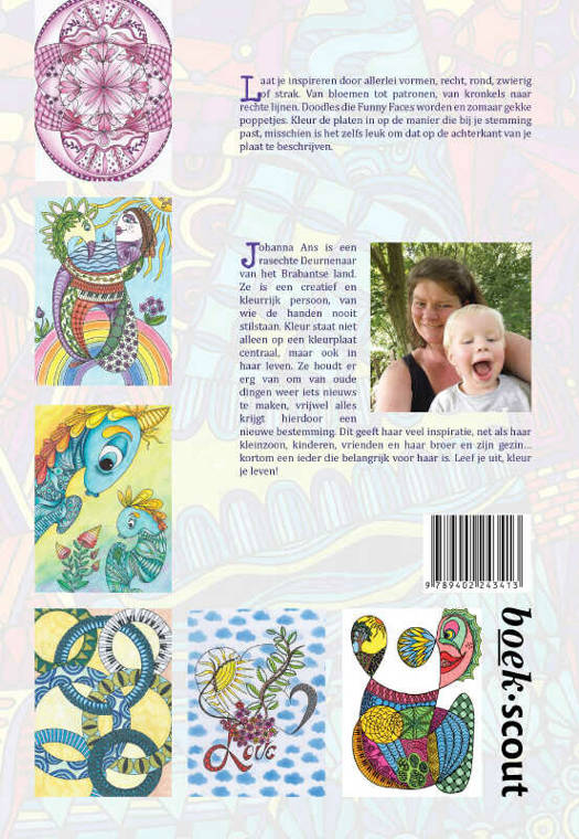 Laat je inspireren door allerlei vormen, recht, rond, zwierig of strak. Van bloemen tot patronen, van kronkels naar rechte lijnen. Doodles die Funny Faces worden en zomaar gekke poppetjes. Kleur de platen in op de manier die bij je stemming past, misschien is het zelfs leuk om dat op de achterkant van je plaat te beschrijven. Het eerste kleurboek van Johanna Ans van den Broek is verkrijgbaar via de Boekscout Webshop !